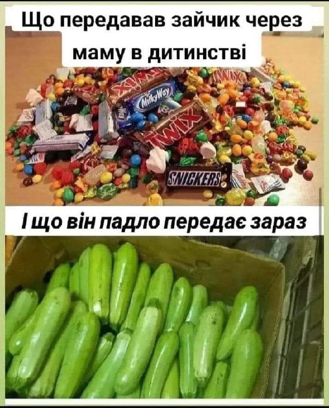 А цей двочастинний мем зворушує до глибини душі. У першій частині — купа солодощів: Twix, Milky Way, Snickers. Підпис: "Що передавав зайчик через маму в дитинстві". У другій частині — повна коробка молодих кабачків. Підпис: "І що він, падло, передає зараз".