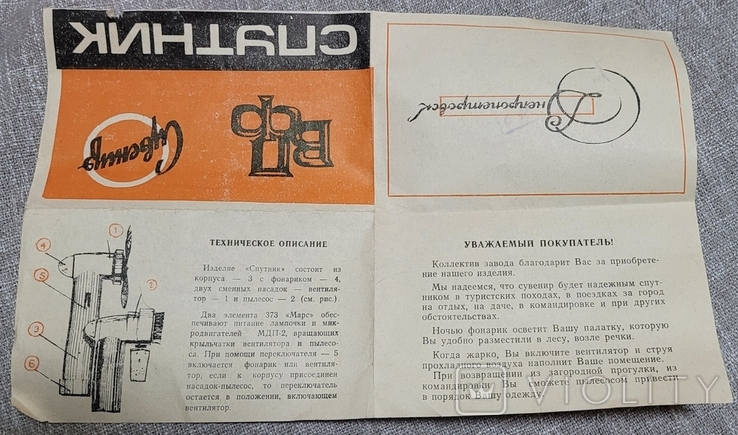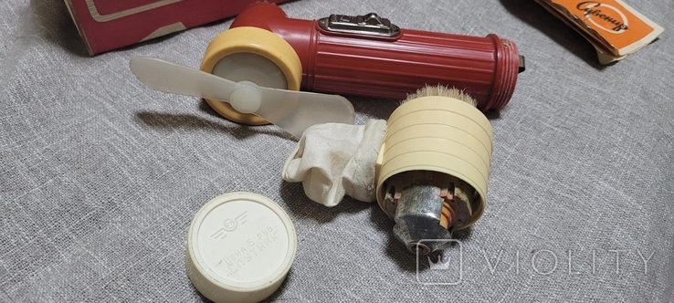 При продажі в СРСР коштував такий гаджет 5 рублів. Наразі ж за нього просять понад 2,1 тисячі гривень. В комплект входять корпус з ліхтариком, насадка для вентилятора, насадка для пилососу. Все це вміщене в компактний пластиковий корпус кольору бордо з кремовими акцентами. Для живлення потрібні елементи 373 Марс, що в комплект не входять. Застосовуються такі батарейки й зараз і мають тип D.