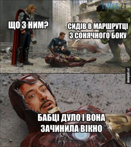 Ситуацію з маршрутками продовжує ще один популярний мем, де супергерої намагаються зрозуміти, що трапилось із товаришем. Виявляється, він сидів біля вікна, через яке "дуло", і пасажирка похилого віку зачинила його. Результат — перегрітий пасажир, який почувається буквально "вареним".