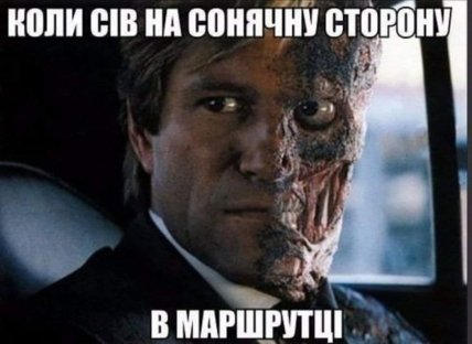 У ще одному іронічному колажі використано образ з фільму про Бетмена: половина обличчя персонажа Харві Дента — обгоріла, друга — ні. Коментар до зображення: "Коли сів на сонячну сторону в маршрутці". Це жарт, який особливо "болить" тим, хто користується громадським транспортом у години пік.