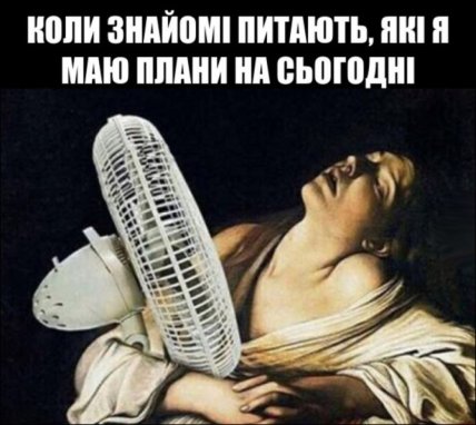 А на цій картині в стилі класичного живопису жінка лежить, а на неї дме вентилятор. Текст: "Коли знайомі питають, які я маю плани на сьогодні". Мем іронізує над тим, як у спеку головний план — це просто вижити в прохолодному місці.