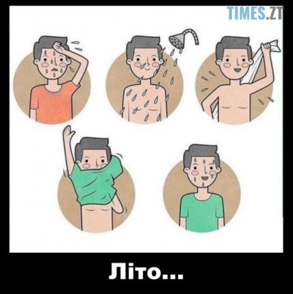 Інші жарти стосуються повсякденних ситуацій, знайомих кожному. Наприклад, чоловік, який щойно вийшов із душу, витерся й одягнувся — і вже знову мокрий від поту. Мем має лаконічний підпис — "Літо…".