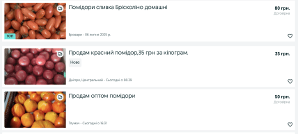 За даними онлайн-платформ торгівлі, ціни на помідори коливаються від 35 до 80 гривень за кілограм залежно від сорту та якості: