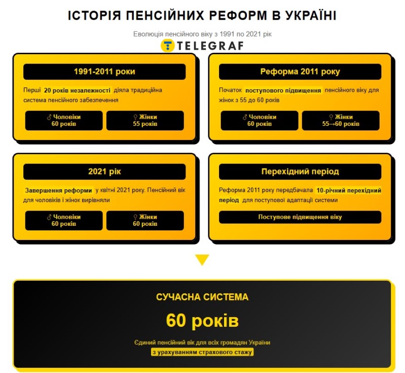 2021 рік — завершення реформи. З квітня 2021 року пенсійний вік для чоловіків і жінок вирівняли до 60 років.