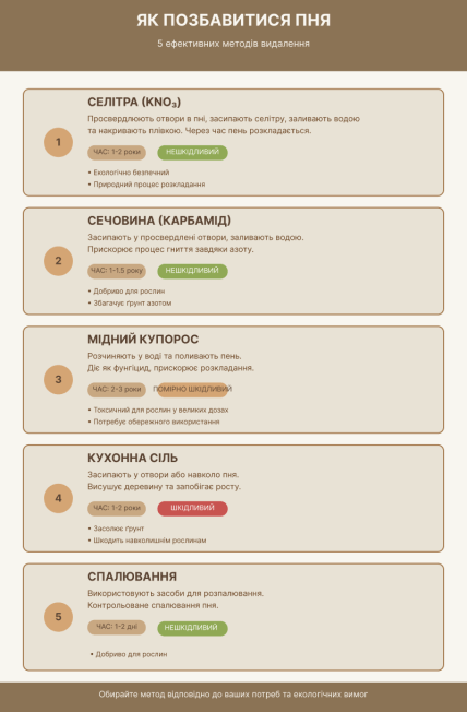 Вибір методу залежить від того, скільки часу ви готові чекати та що плануєте робити з ділянкою. Для швидкого результату найкраще підійде спалювання пня. Якщо ви не поспішайте і хочете зберегти ґрунт родючим — підійдуть сечовина або селітра. Купорос допоможе, якщо пень був заражений, а сіль варто застосовувати лише у крайніх випадках.