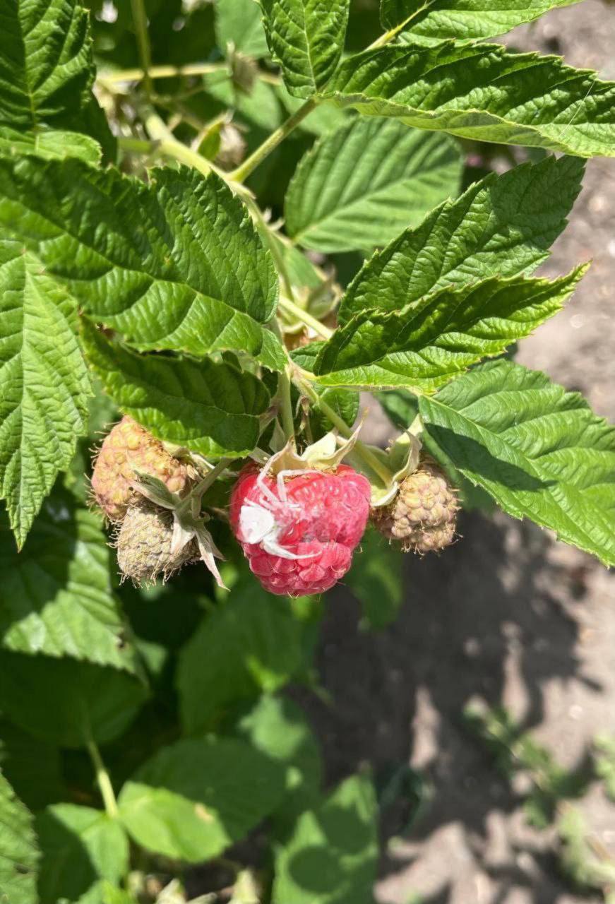 Фото павука-краба на малині опублікували в мережі. Він здатний змінювати колір під колір місця полювання. Наприклад, може стати жовтим, чи зеленим.
