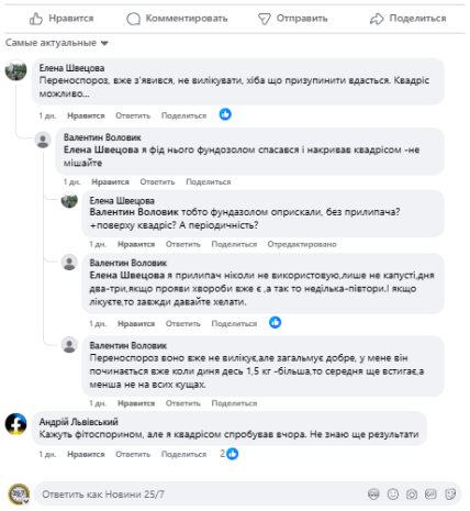 Користувачі розповіли, що повністю вилікувати рослину від пероноспорозу не вдасться, але можна призупинити розвиток захворювання. Жінці порадили застосувати фунгіциди "Квадріс" та "Фундазол" або біофунгіцид "Фітоспорин".