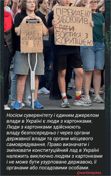 В Україні кілька днів поспіль тривають протести проти закону про НАБУ та САП. Вони охопили великі та малі міста: Київ, Львів, Чернігів, Дніпро, Запоріжжя, Кременчук та багато інших. Однак не тільки протест привертає увагу. Українці поставились до нього з гумором.