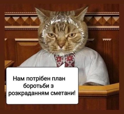 На іншому мемі можна знову побачити кота, який найімовірніше символізує народного депутата. Тварина одягнена у вишиванку і стоїть на трибуні Верховної Ради. Її мордочка забруднена у сметані. Водночас кіт каже, що потрібен план боротьби з розкраданням сметани.