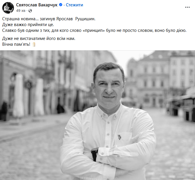 На загибель народного депутата відреагував і засновник партії "Голос", музикант Святослав Вакарчук. Він наголосив — для Рущишина "принцип" був не просто словом.