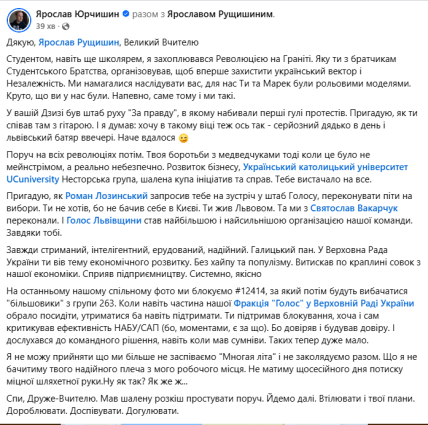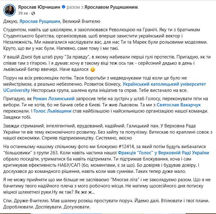 "Завжди стриманий, інтелігентний, ерудований, надійний. Галицький пан. У Верховній Раді України ти вів тему економічного розвитку. Без хайпу та популізму. Витискав по краплині совок з нашої економіки. Сприяв підприємництву. Системно, якісно", — так описує Юрчишин загиблого. Він закликав цінувати життя та тих, хто поруч поки ще не пізно.