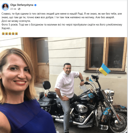 Той самий "Харлей" є і у спогадах народної депутатки Ольги Стефанішиної. "Я не знаю, як ми без тебе, але знаю, що там де ти, точно вже все добре. І ти там теж напевно на мотику. Але без аварій", — пише вона.