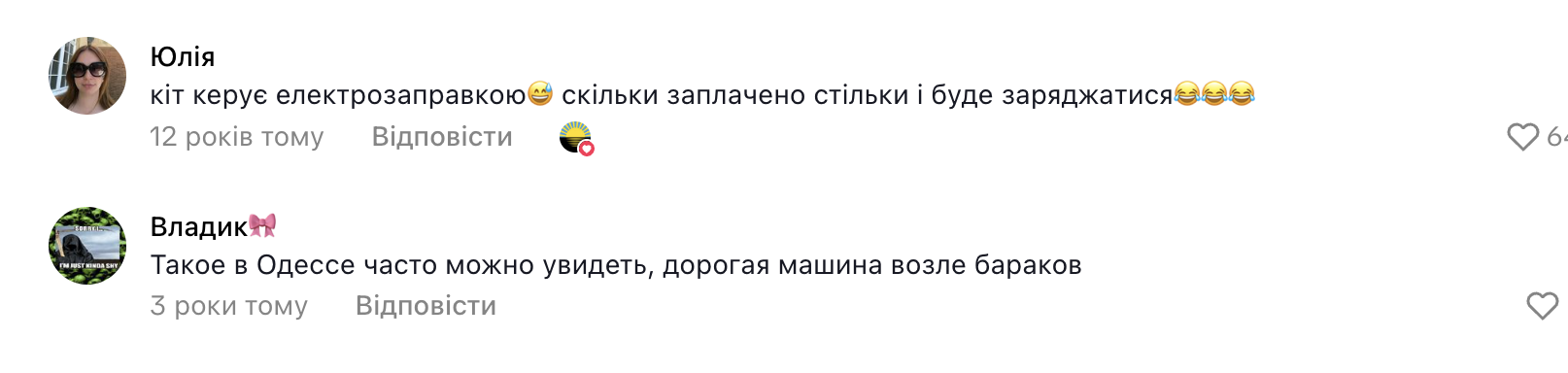 У коментарях користувачі вже відмітили, що це відео яскраво демонструє одеський вайб, де є і круті тачки, і пошарпані будинки, і навіть котики. Дехто писав, що ця автівка точно належить людині, яка постійно каже, що у неї немає грошей. Були і ті, хто розповідали про схожі випадки в інших містах України.