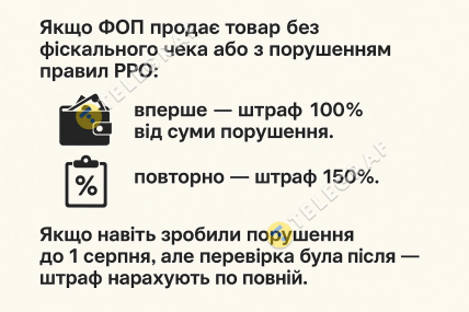 З 1 серпня завершується дія перехідного періоду, протягом якого діяли знижені штрафи для підприємців за порушення касової дисципліни. Продавцям, що працюють без касового апарату і не видають фіскальні чеки тепер доведеться платити 100% вартості товару або послуги за перше порушення, за друге і наступні покарання зросте до 150%.