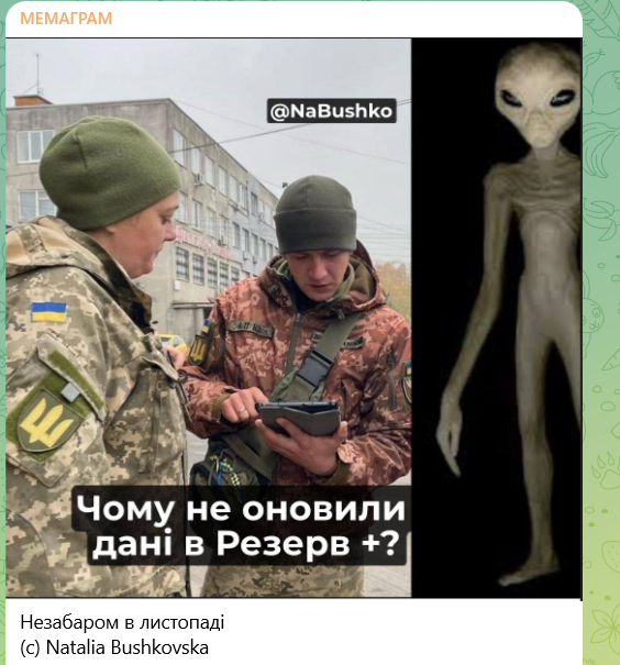 Другий мем — це сцена з двома військовими ТЦК, які дивляться в планшет, а поруч зображення інопланетянина з підписом "Чому не оновили дані в Резерв+?". Тут висміюється українська мобілізаційна система, яка нікого не обходить, навіть чужопланетян, що підкреслює жартівливу всепроникність української бюрократії.