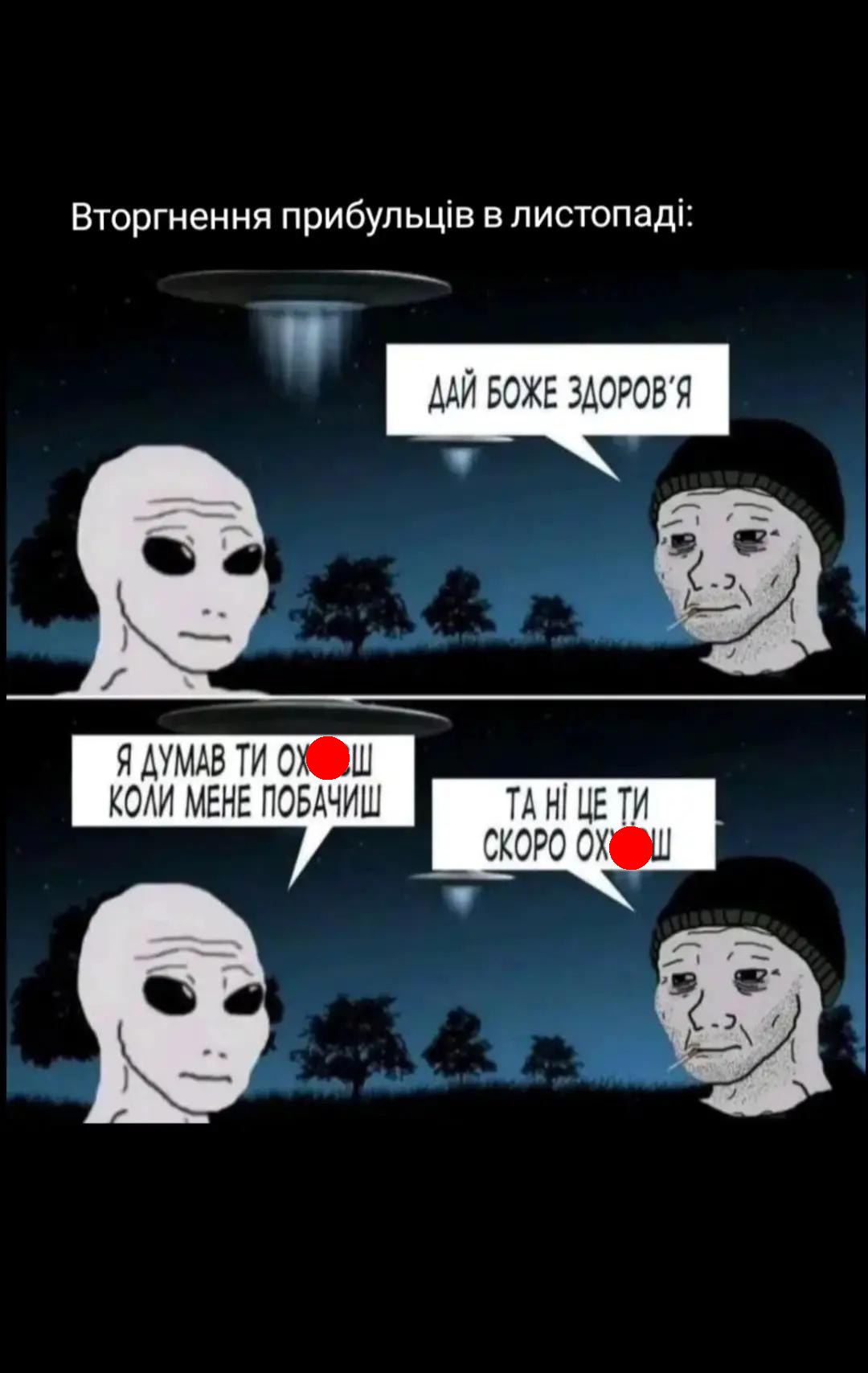 Далі — діалог між інопланетянином і людиною, де прибулець очікує шокувати землянина, а натомість отримує побажання "Дай божє здоров'я" і розуміння, що тут "очманіти" доведеться саме йому. Цей мем показує звиклість українців до абсурду та випробувань, зображаючи їх як незламних і витривалих.