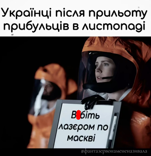 А цей жарт показує українців у захисних костюмах, які тримають табличку з фразою "В'ї**ть лазером по Москві". Це — вираз бойового настрою, де прибульці уявляються потенційними союзниками в боротьбі проти ворога.