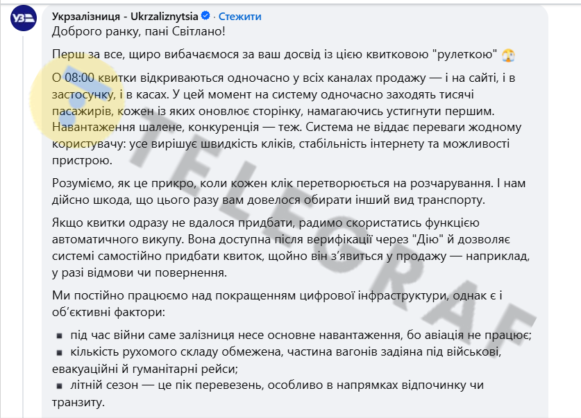 Перевізник запевнив, що працює над покращенням сервісів з продажу квитків. Проте, зазначили у УЗ, є об'єктивні фактори їхньої нестачі: