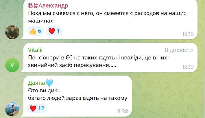 В мережі жартують, що різко повертати на такому транспорті не можна. Пишуть, що його часто бачать в Полтаві, та й у інших містах. Один з коментаторів додав, що на таких у Європі їздять пенсіонери та люди з інвалідністю — це в них звичайний засіб пересування.