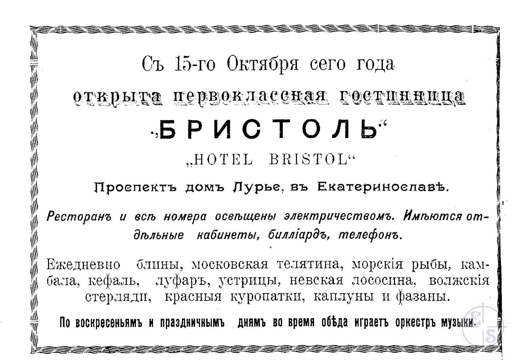 Триповерховий "Бристоль" відкрився 1899 року на центральному проспекті, поруч із готелем "Пальміра". Від самого початку він вважався передовим за рівнем комфорту.