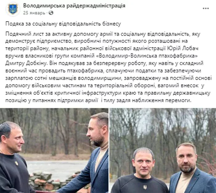 У травні 2025 року СБУ запідозрила бізнес Добкіних — Володимир-Волинську птахофабрику — у пособництві країні-агресорці. Зазначається, що у 2019–2021 роках підприємство відправляло продукцію з птиці за готівку на території псевдореспубліки "ЛНР" та до Росії. Окрім цього, підозра полягала у тому, що компанії, підпорядковані Добкіним, проводять операції "задля фінансування діяльності військових формувань країни-окупантки".