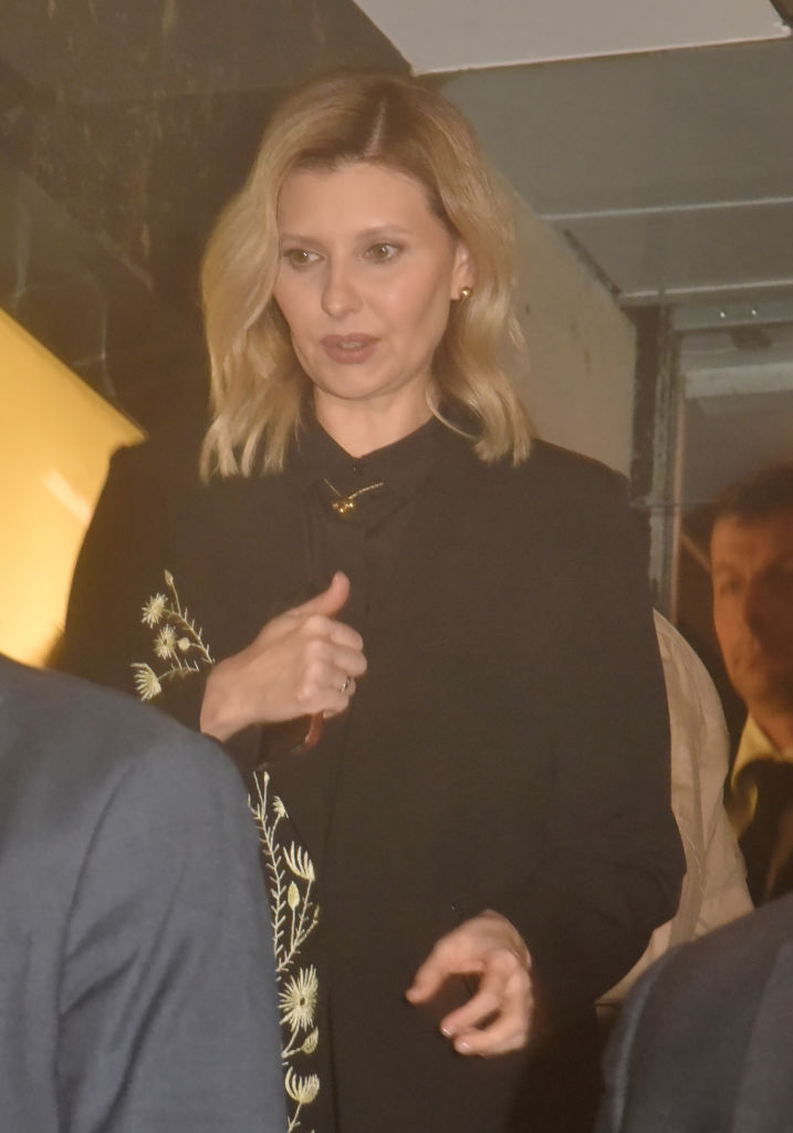 Дружина Зеленського часто доповнює свої образи стильними вишуканими сережками та оригінальними брошками чи іншими мінімалістичними аксесуарами. В одязі перша леді України віддає перевагу елегантним брючним костюмам, а також традиційним вишиванкам.