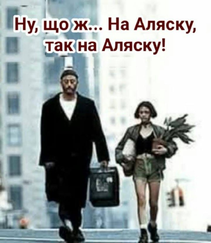 Ще один мем використовує кадр із культового фільму "Леон: Професіонал", де відомі персонажі нібито змушені вирушити на Аляску через події дипломатичної зустрічі. Драматичний контекст кадру контрастує з абсурдною ситуацією, що додає гумору.