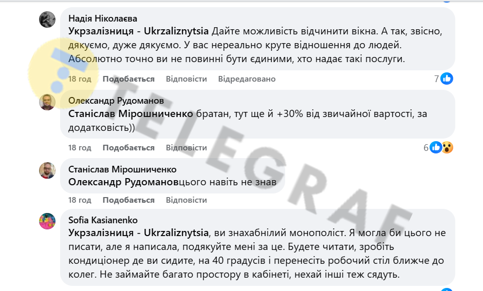 Дайте можливість відчинити вікна. А так, звісно, дякуємо, дуже дякуємо. У вас нереально круте відношення до людей. Абсолютно точно ви не повинні бути єдиними, хто надає такі послуги", "Укрзалізниця, ви знахабнілий монополіст. Я могла би цього не писати, але я написала, подякуйте мені за це. Будете читати, зробіть кондиціонер де ви сидите, на 40 градусів і перенесіть робочий стіл ближче до колег. Не займайте багато простору в кабінеті, нехай інші теж сядуть, — іронізують в мережі