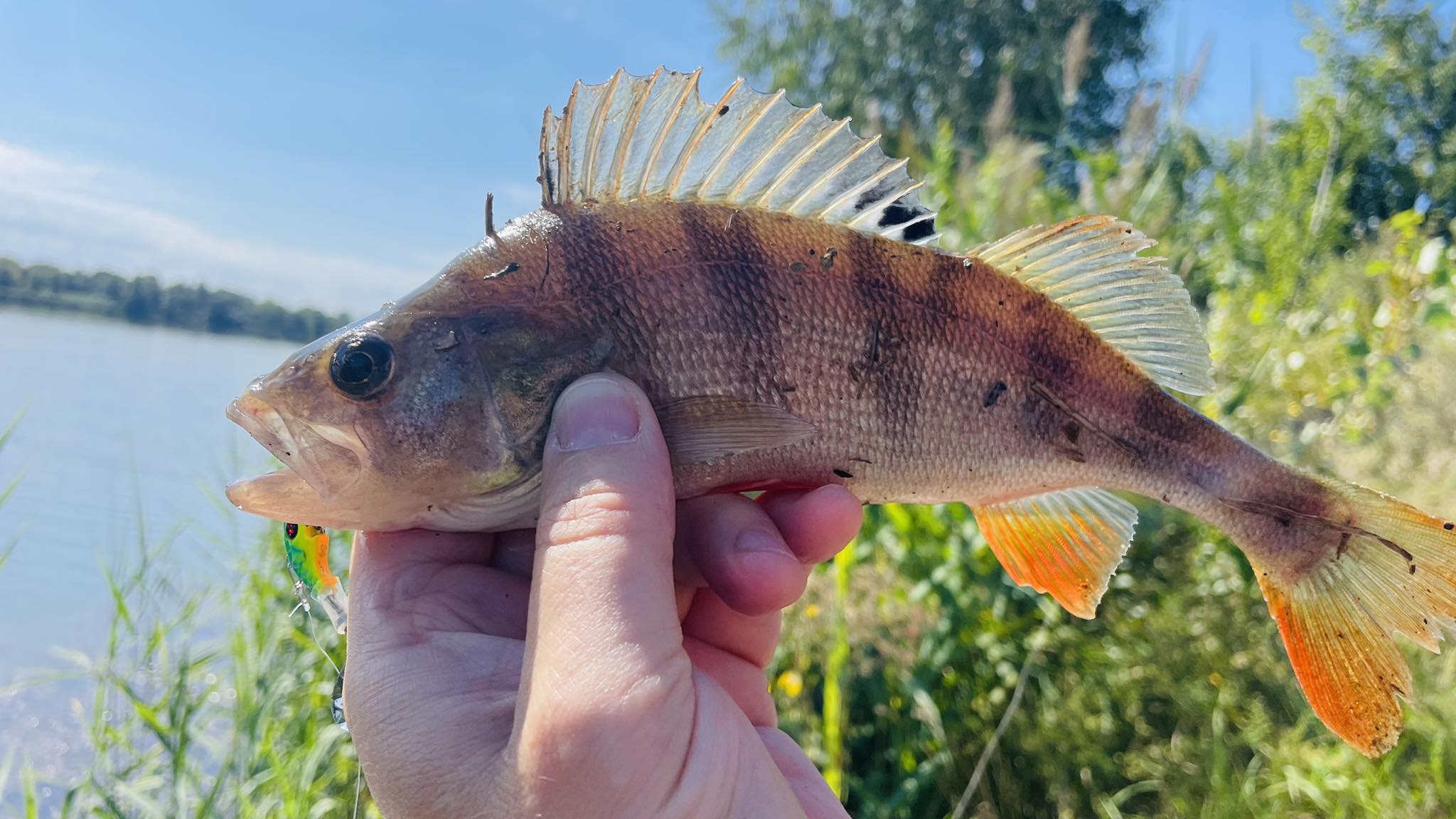 Рибалка показав фото риби — окунь приблизно з долоню дорослого чоловіка. Хижак виглядає дуже фотогенічно, майже як казкова золота рибка — золотаві плавники окуня виблискують на сонці.
