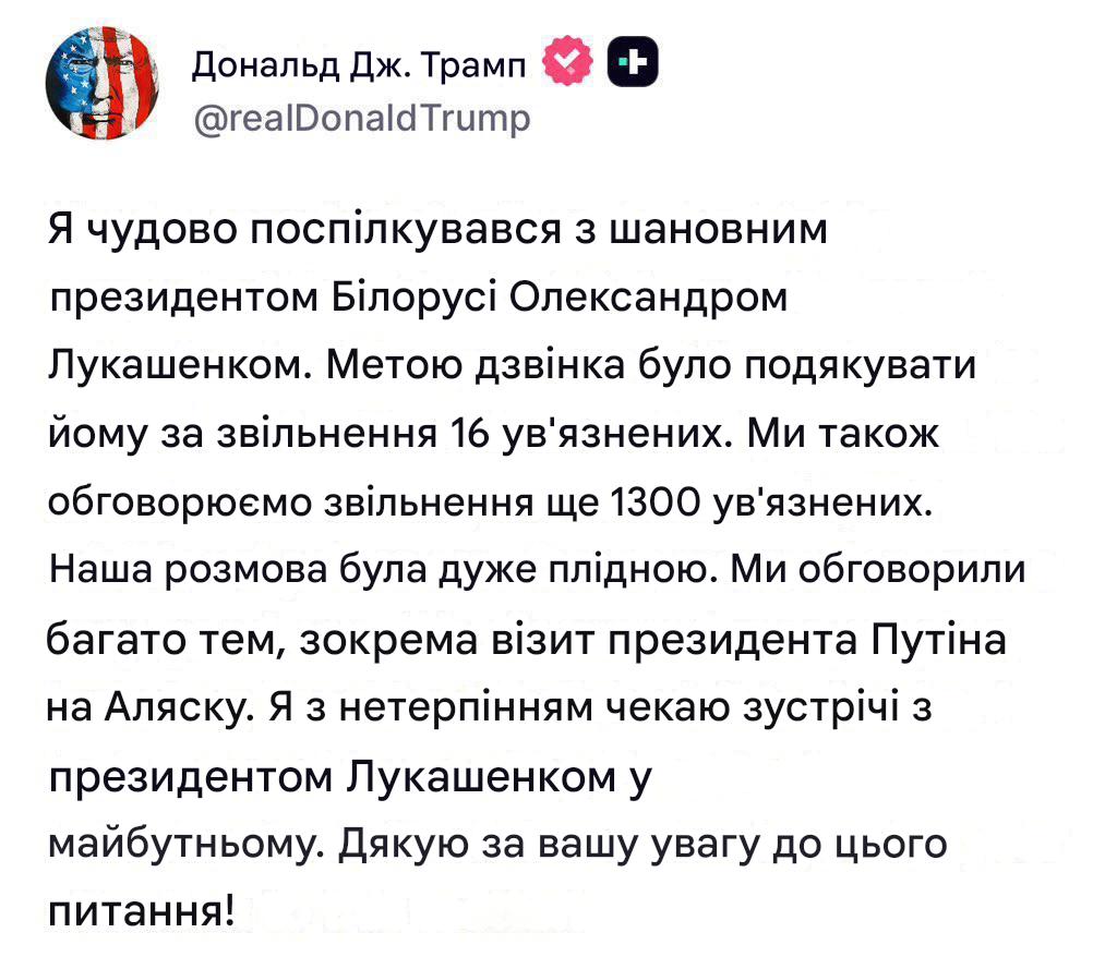 За його словами, він "мав чудову розмову" з главою Білорусі. Розмова відбулася з ініціативи президента США, який вирішив подякувати Лукашенку за визволення 16 ув’язнених. Трамп додав, що зараз обговорюється питання звільнення ще 1300 ув’язнених.