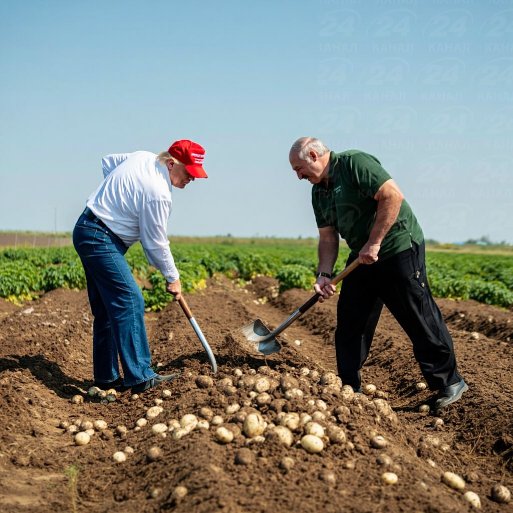 Інше зображення показує, що Лукашенко не зміг не скористатися дармовою робочою силою та залучив Дональда Трампа до сільськогосподарських робіт. Президенту США довелося копати картоплю, адже зараз – самий сезон.