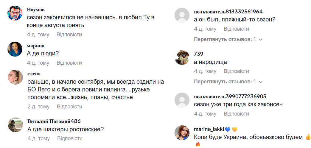 До речі, у коментарях до цього відео українці висловилися, що колись дуже любили Кирилівку, проте зараз туди не їдуть через окупацію. А ще з автора поглумилися і нагадали, що туристичний сезон з початку повномасштабної війни в окупації і не розпочинався — ось уже три роки.