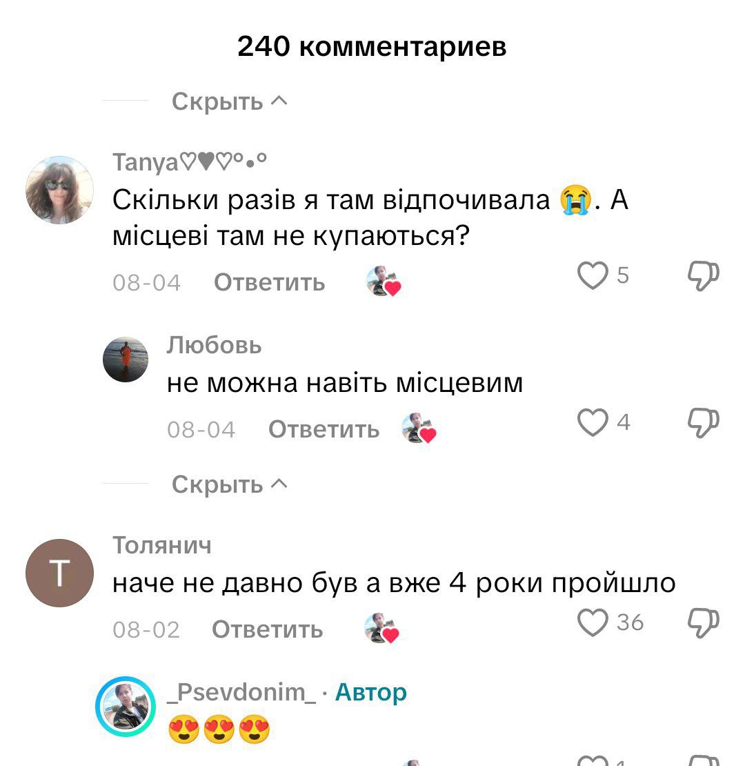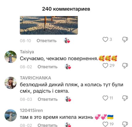 А після окупації Росія привела курортне селище в занепад. На відео, знятому у липні 2025 року, видно, що на пляжі зовсім нема людей. Там валяються водорості, а з піску стирчать металеві конструкції. У коментарях до відео люди наголошують, що купатися там заборонили.