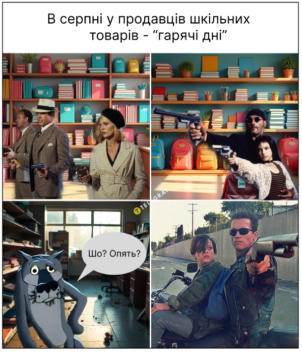 І, нарешті, ми не забули про власників та продавців магазинів шкільних товарів, адже для них у серпні наступають "гарячі дні". Відвідувачі бувають різні, зокрема вони можуть нагадувати Бонні та Клайда чи Леона-кіллера.