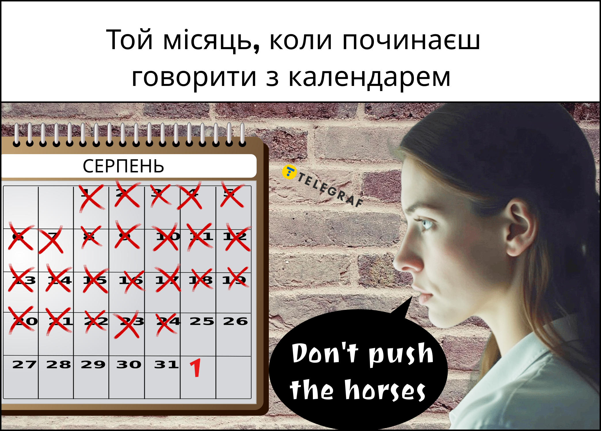 Інша жінка на тлі стресу, спричиненого наближенням 1 вересня, почала розмовляти з календарем. Тут ми обіграли знаменитий вислів іменитого українського боксера Олександра Усика "Don’t push the horses", що в перекладі означає "не штовхайте коней". Своїми словами спортсмен викликав здивування в англомовному сегменті мережі, оскільки правильно приказка звучить як Hold your horses (дослівно притримайте коней).