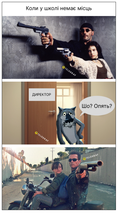У третьому мемі ми в жартівливій формі порушили тему, яка хвилює багатьох батьків. Через війну сім’ї з дітьми переїжджають до інших міст, а отже, школярі змушені міняти навчальні заклади, що не завжди буває просто. Ми використовували відомі кадри зі знаменитих фільмів "Леон" та "Термінатор". До речі, днями у центрі Києва відтворили культову сцену зі згаданої кінострічки за участю Жана Рено та Наталі Портман.
