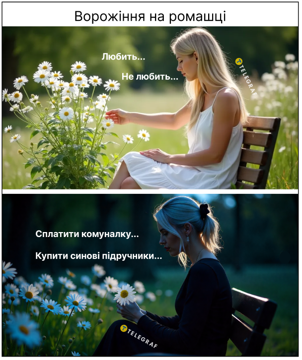 Потім ми порівняли гадання на ромашці двох дівчат, одна з яких тільки мріє про сім’ю, а друга вже має дитину. Перша традиційно ворожить на кохання, друга ж обриває у квітки пелюстки, щоб зробити нелегкий вибір: заплатити за комуналку чи купити дитині підручники.