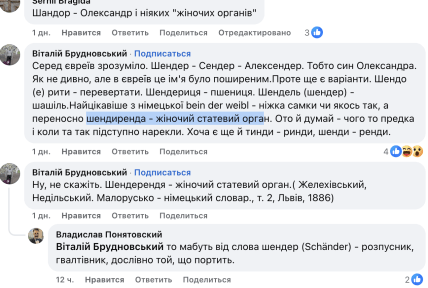 Однак у коментарях чимало користувачі згадало, що Шердерук дуже схоже на слово Шендер, яке є і в німецькій мові. Зазначається, що німецьке слово "шендерендя" — це жіночий статевий орган (Желехівський, Недільський. Малорусько — німецький словар., т. 2, Львів, 1886). Тобто прізвища з коренем "Шендер" цілком можуть походити від неофіційної назви статевих жіночих органів німецькою.