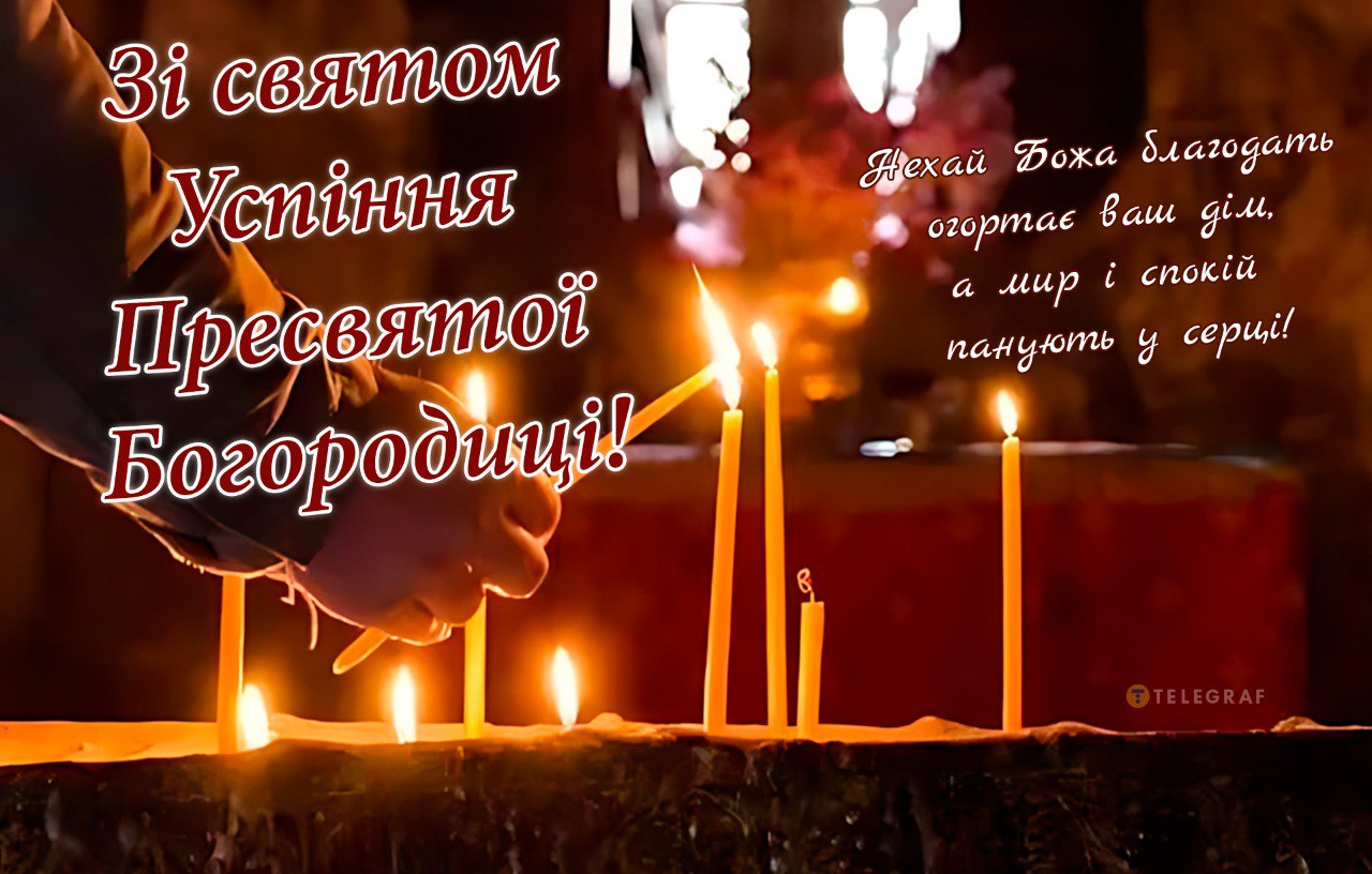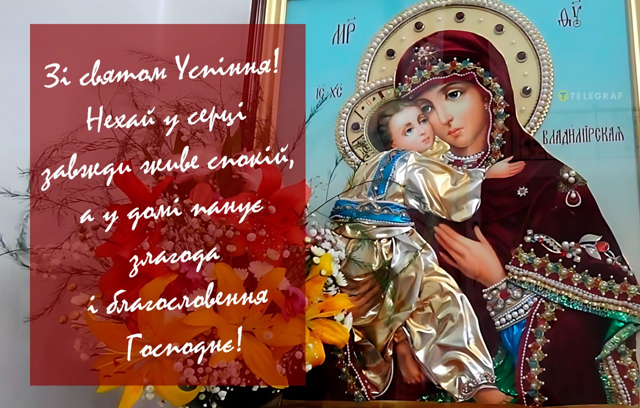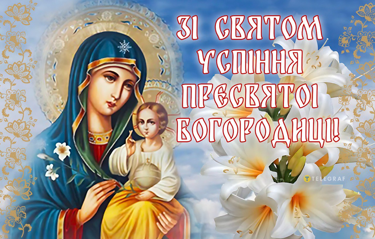 Цього дня можна привітати рідних зі святом Успіння Пресвятої Богородиці та побажати їм миру та процвітання. Поділіться теплими словами та увагою зі своїми близькими. "Телеграф" підготував яскраві картинки та листівки, щоб ви могли привітати родичів та друзів у соцмережах та месенджерах з великим церковним святом.