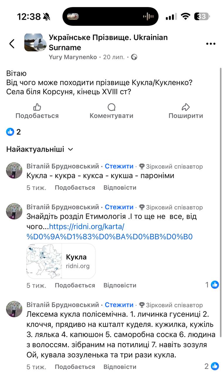 Про його походження запитав користувач у Facebook спільноті "Українське прізвище". Він поцікавився, від чого може походити прізвище Кукла/Кукленко, згадавши, що зустрічав його в селі біля Корсуня наприкінці XVIII століття.