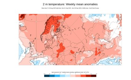 На карті показано середнє відхилення температури повітря в Європі від багаторічної норми за період із 1 по 8 вересня. Як бачимо, в Україні аномалія у зазначені дати становитиме в середньому +2…+5 градусів,