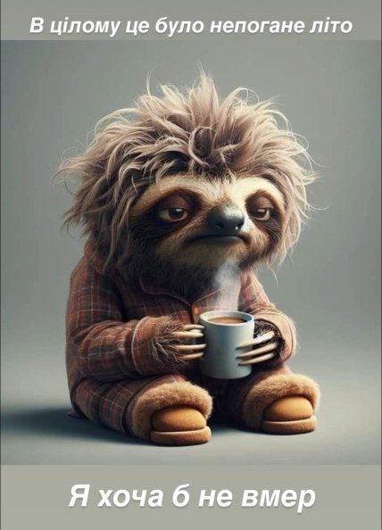 В Україні було настільки багато обстрілів, що люди створили мем з ледачим лінивцем, який тримає чашку та каже: "В цілому це було непогане літо. Я хоча б не вмер". Цей чорний гумор відображає реалії війни, коли виживання стає головним досягненням сезону.
