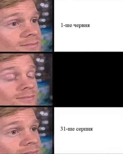 Літо 2025 року виявилося настільки буремним, що українці навіть не встигли його відчути. Це демонструє перший мем, де показано, як люди не встигли навіть дочекатися 1 червня, як уже настало 31 серпня. Популярний інтернет-формат з трьома панелями показує радісне обличчя на початку літа, потім чорну пустоту замість середини сезону, і знову здивоване обличчя наприкінці.