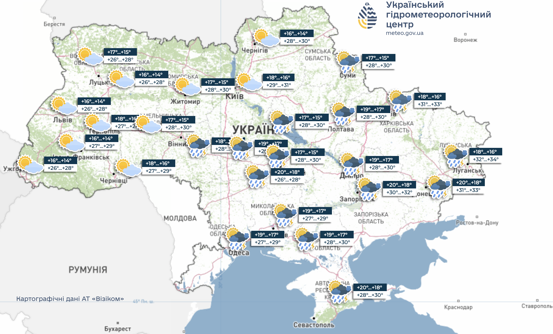 Найтепліше буде на півдні та заході України — до +32°С у деяких районах, тоді як у дощових зонах температура не перевищуватиме +25-30°С.