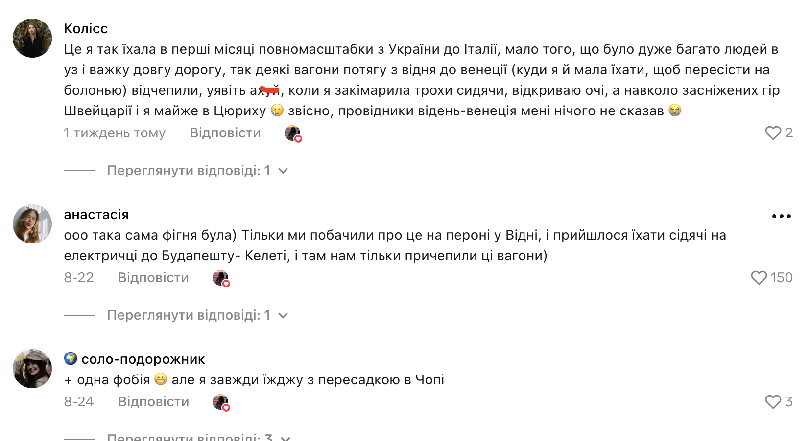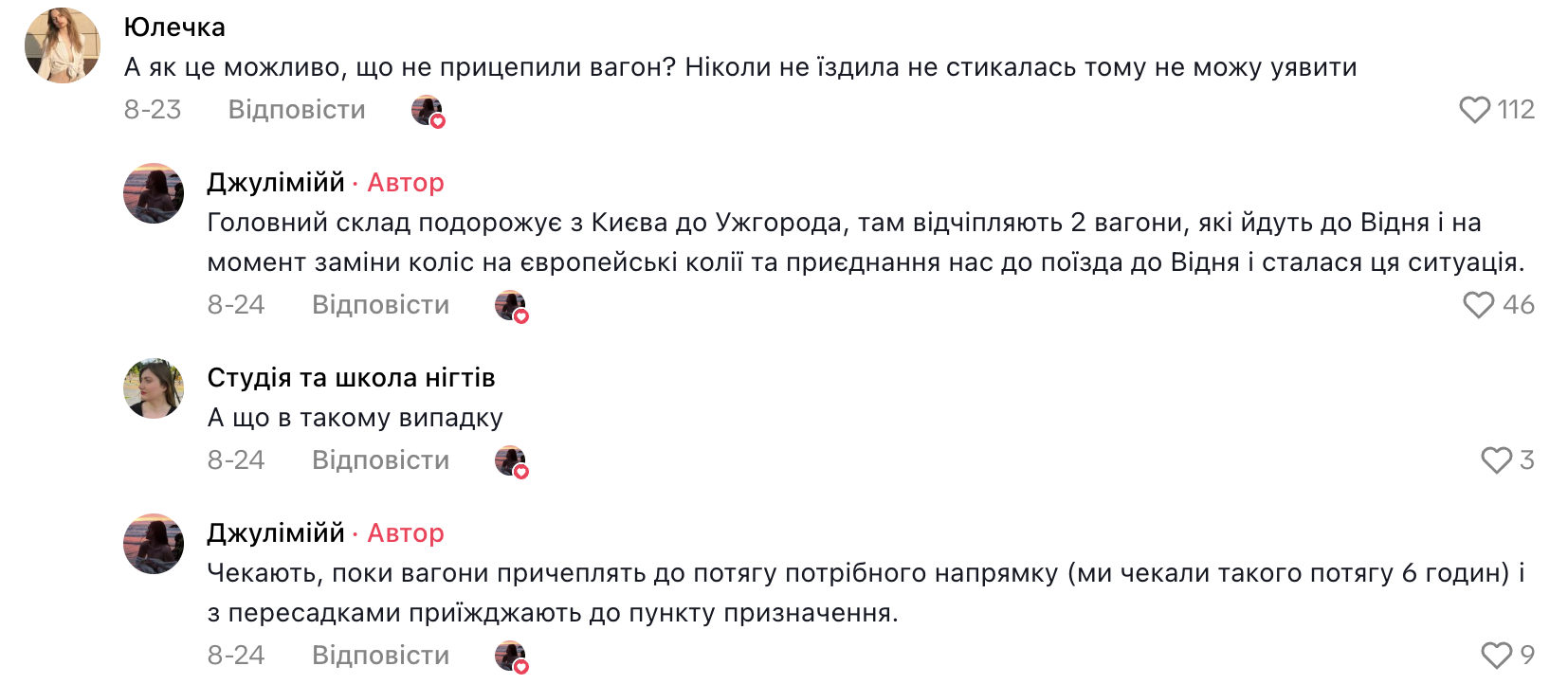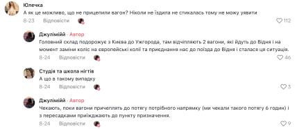 У коментарях пасажирка додала, що поїзд Київ-Відень їде з Києва до Ужгорода, де відчіпляють 2 вагони, які йдуть до Відня. Але тут сталась затримка і на кордоні вагони не приєднали до потрібного поїзда. В такому випадку треба чекати наступний рейс потрібного напрямку. У цьому випадку затримка була 6 годин.