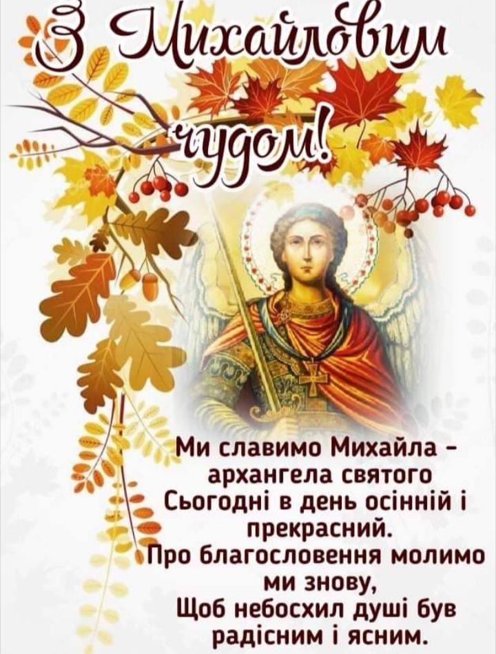 В цей світлий день хочу привітати вас з Михайловим дивом. Нехай це свято наповнить ваш дім радістю і теплом. Нехай архангел Михаїл заступає вас у всіх справах і дарує вам мудрість, силу і впевненість. Бажаю вам щастя і здоров’я.