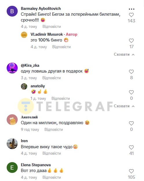 У соцмережі ТікТок активно обговорюють це і жартують, що після такої риболовлі варто купувати лотерейні білети, адже це справжній знак удачі. Інші пишуть, що це схоже на "акцію: одну купуєш — другу отримуєш у подарунок".