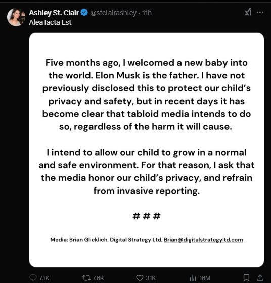 Ешлі попросила медіа дати їй спокій, аби "дитина росла в нормальному та безпечному середовищі". Також вона сказала, що не публікуватиме фото дитини від мільярдера. Сам Маск не коментував факт народження його 13-ї дитини.