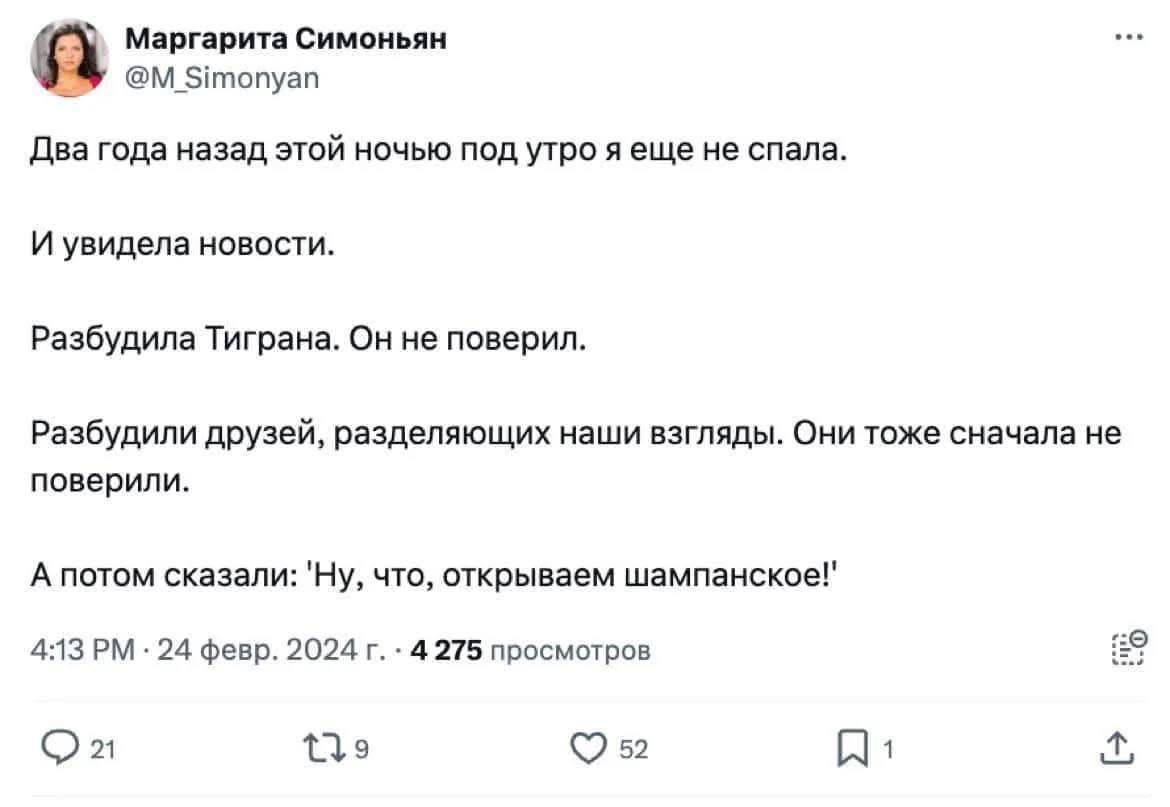У мережі згадали один з досить скандальних та провокаційних дописів пропагандистки Симоньян. У ньому вона згадала 24 лютого 2022 року, коли Росія почала повномасштабне вторгнення в Україну.