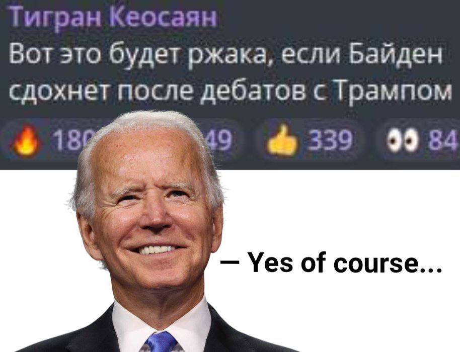 Ще одним дописом, який у мережі згадали, був пост Кеосаяна, в якому він висміював колишнього президента США Джо Байдена. Чоловік пропагандистки написав, що було б спішно, якби Байден помер після дебатів з чинним головою Білого дому Дональдом Трампом. Але 46-й президент США живий, а от Кеосаян — ні.